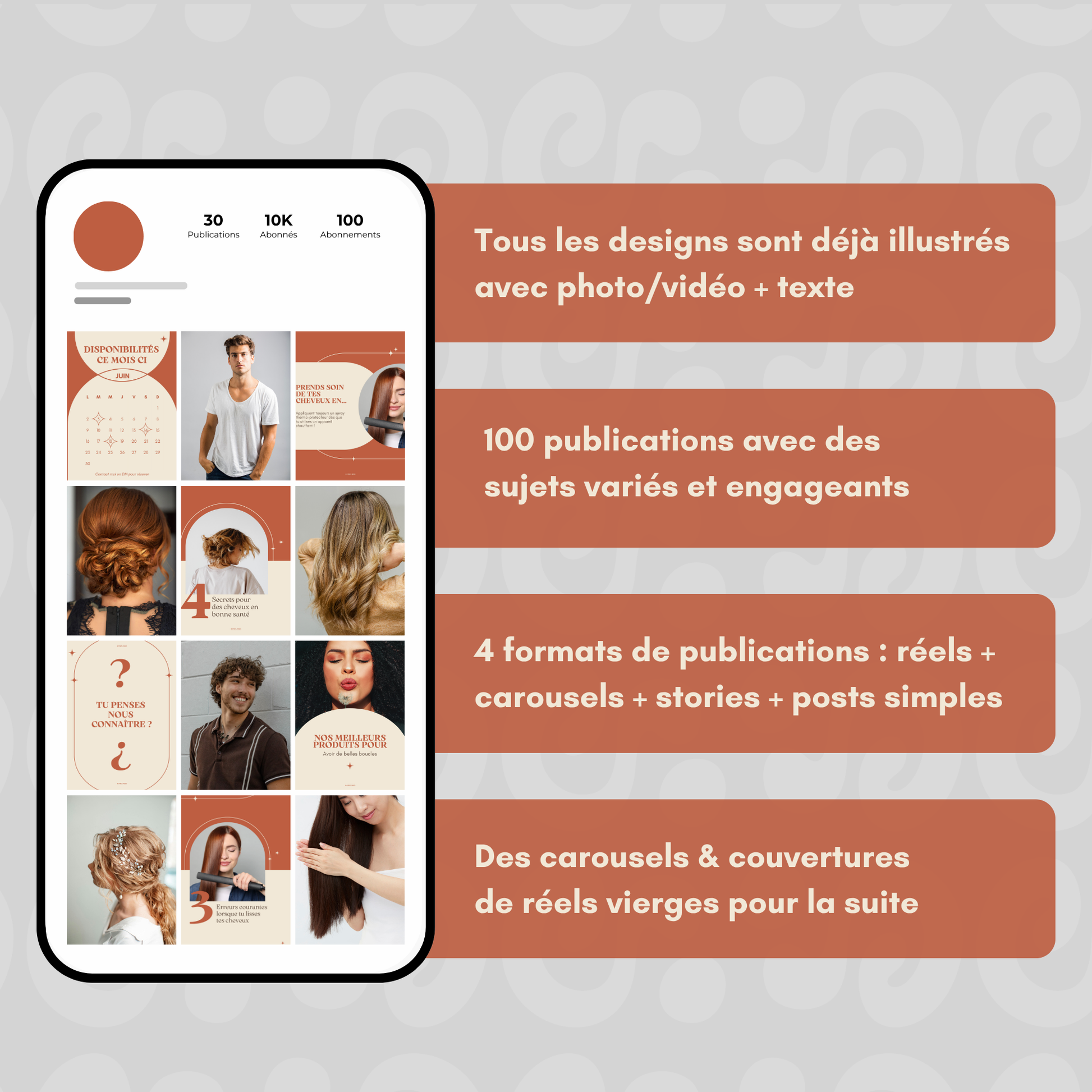 100 publications pensées pour attirer et fidéliser ta cible client : conseils et astuces, questions fréquentes, expériences clients, anecdotes amusantes...