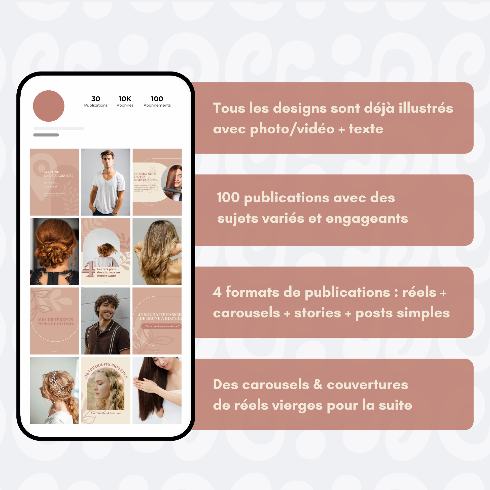 100 publications pensées pour attirer et fidéliser ta cible client : conseils et astuces, questions fréquentes, expériences clients, anecdotes amusantes...