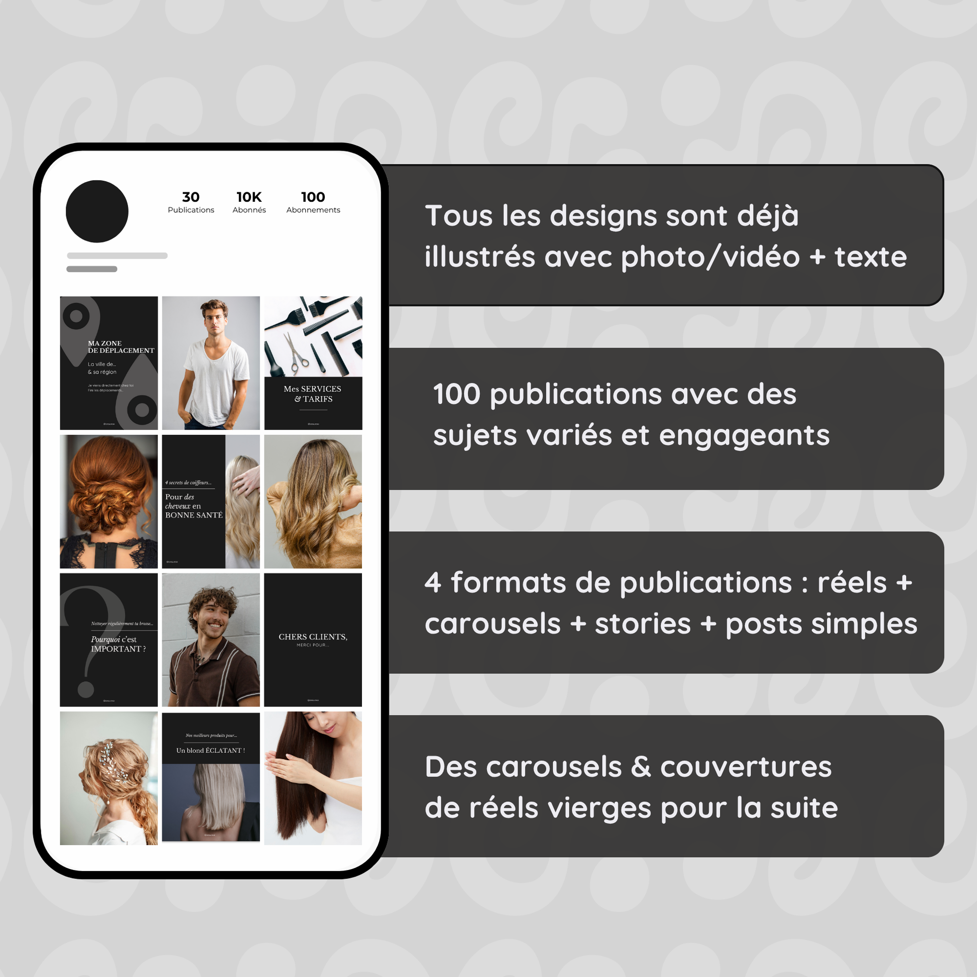 100 publications pensées pour attirer et fidéliser ta cible client : conseils et astuces, questions fréquentes, expériences clients, anecdotes amusantes...