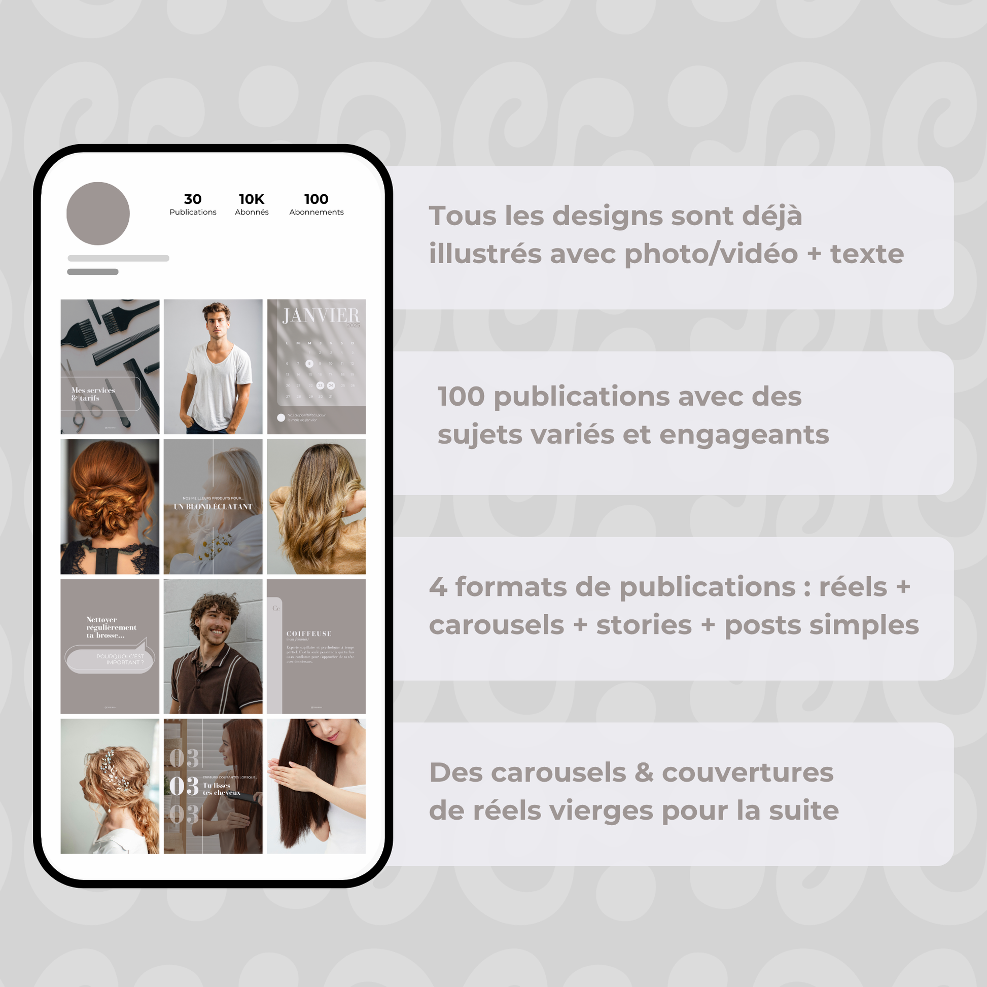100 publications pensées pour attirer et fidéliser ta cible client : conseils et astuces, questions fréquentes, expériences clients, anecdotes amusantes...
