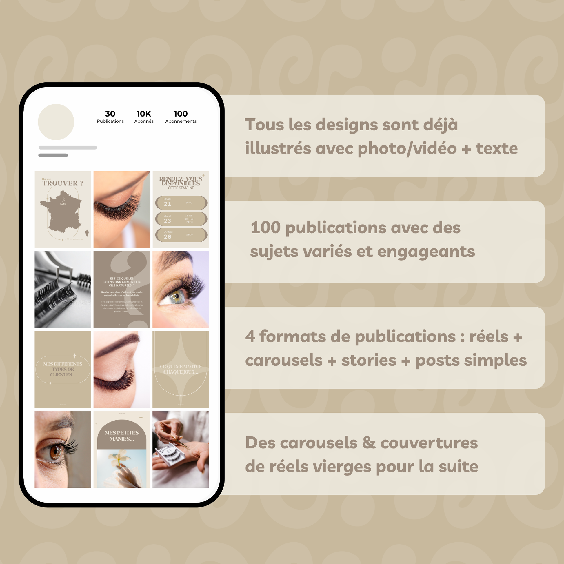 100 publications pensées pour attirer et fidéliser ta cible client : conseils et astuces, questions fréquentes, expériences clients, anecdotes amusantes...