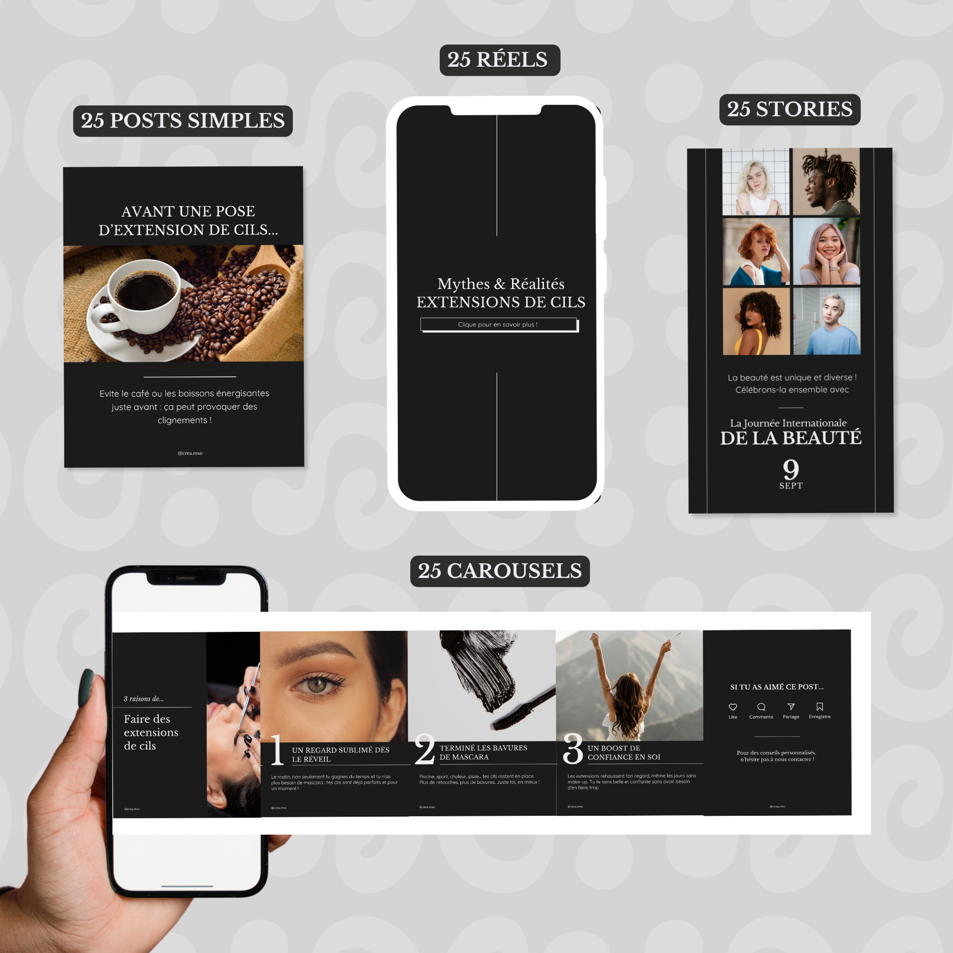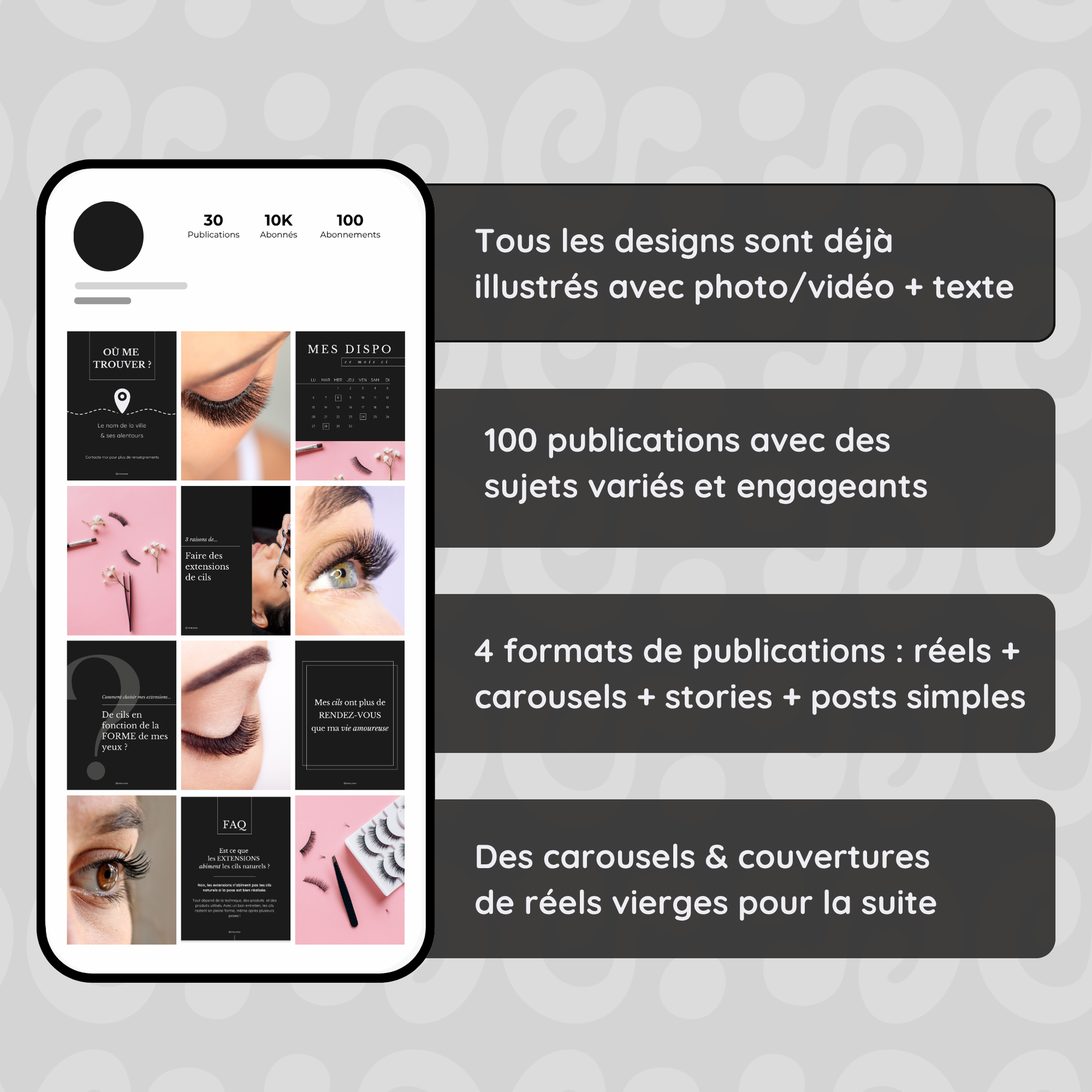 100 publications pensées pour attirer et fidéliser ta cible client : conseils et astuces, questions fréquentes, expériences clients, anecdotes amusantes...