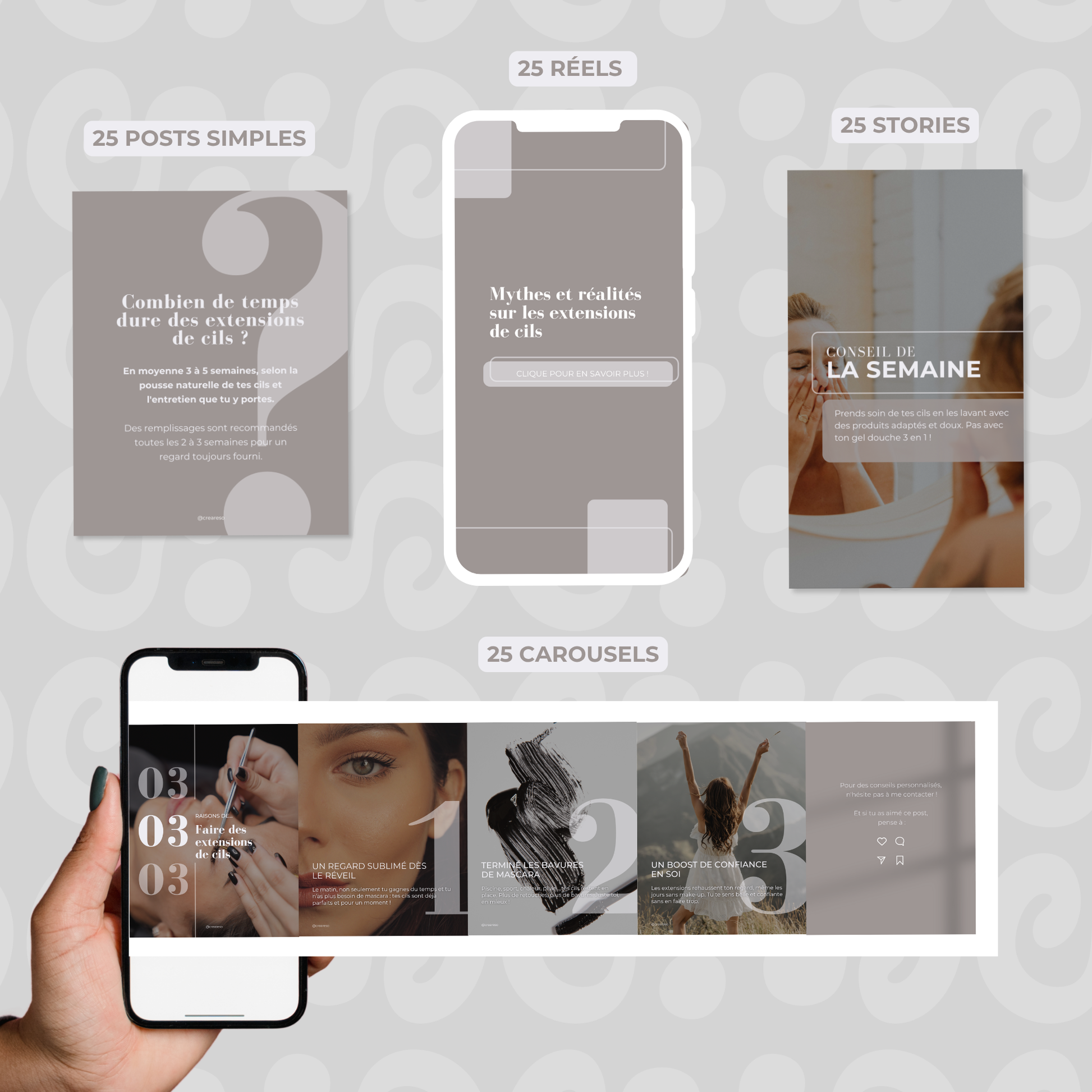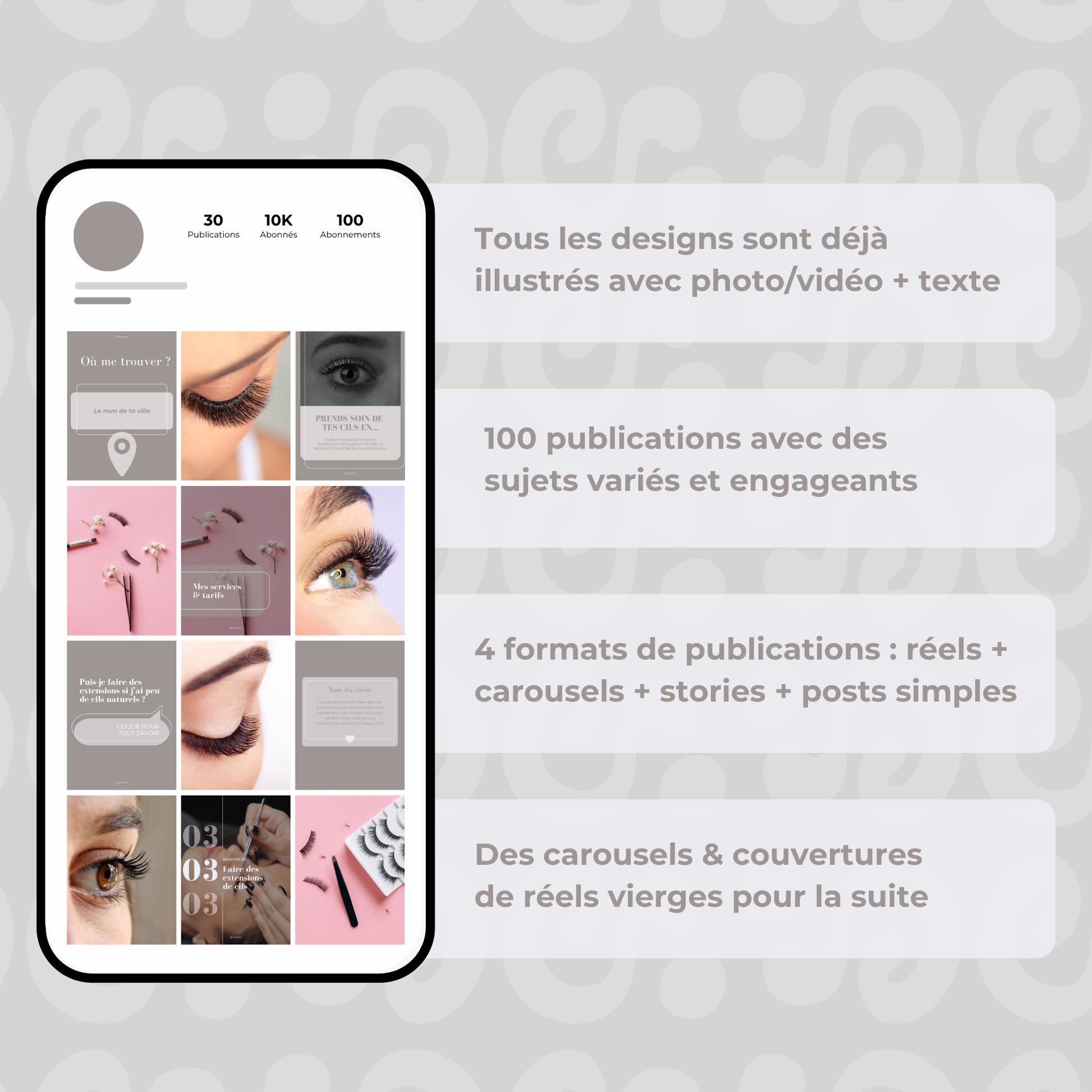 100 publications pensées pour attirer et fidéliser ta cible client : conseils et astuces, questions fréquentes, expériences clients, anecdotes amusantes...