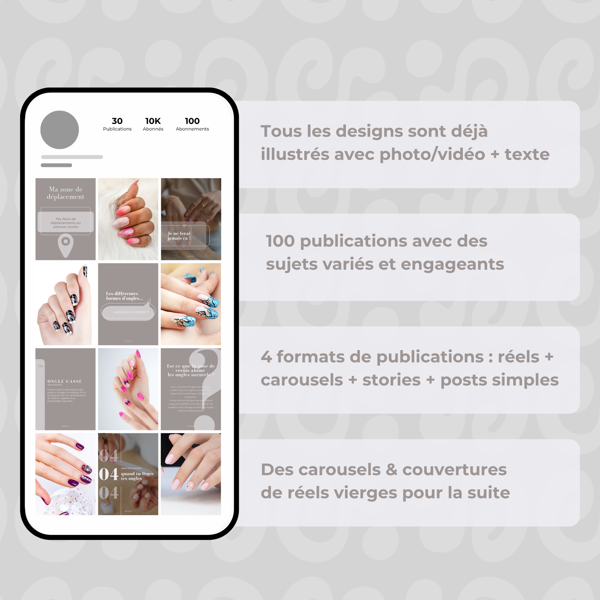 100 publications pensées pour attirer et fidéliser ta cible client : conseils et astuces, questions fréquentes, expériences clients, anecdotes amusantes...